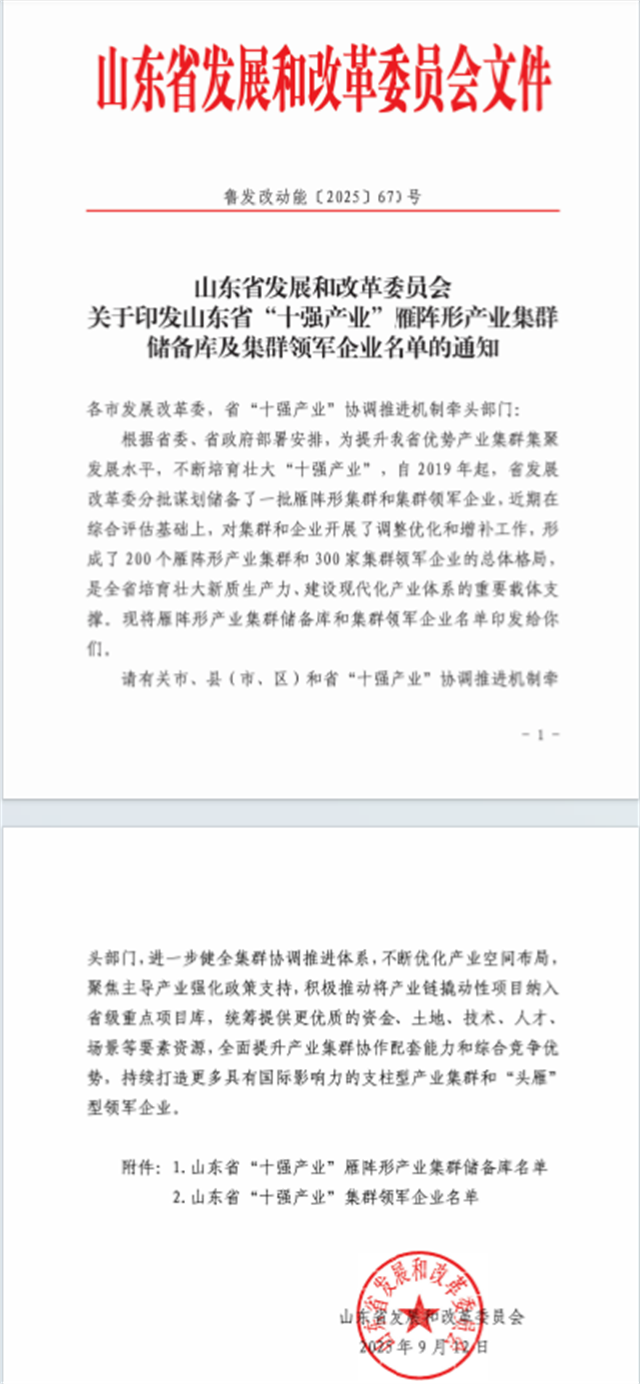 近日,省發(fā)展改革委組織開展了2025年度省“十強(qiáng)產(chǎn)業(yè)”雁陣形產(chǎn)業(yè)集群及集群領(lǐng)軍企業(yè)評(píng)選工作,經(jīng)行業(yè)評(píng)價(jià)、專家評(píng)審、綜合論證等程序,研究確定了擬增補(bǔ)雁陣形產(chǎn)業(yè)集群28個(gè),集群領(lǐng)軍企業(yè)27家。公司憑借在行業(yè)中的顯著優(yōu)勢(shì)和綜合實(shí)力,成功入選山東省“十強(qiáng)產(chǎn)業(yè)”集群領(lǐng)軍企業(yè)。
